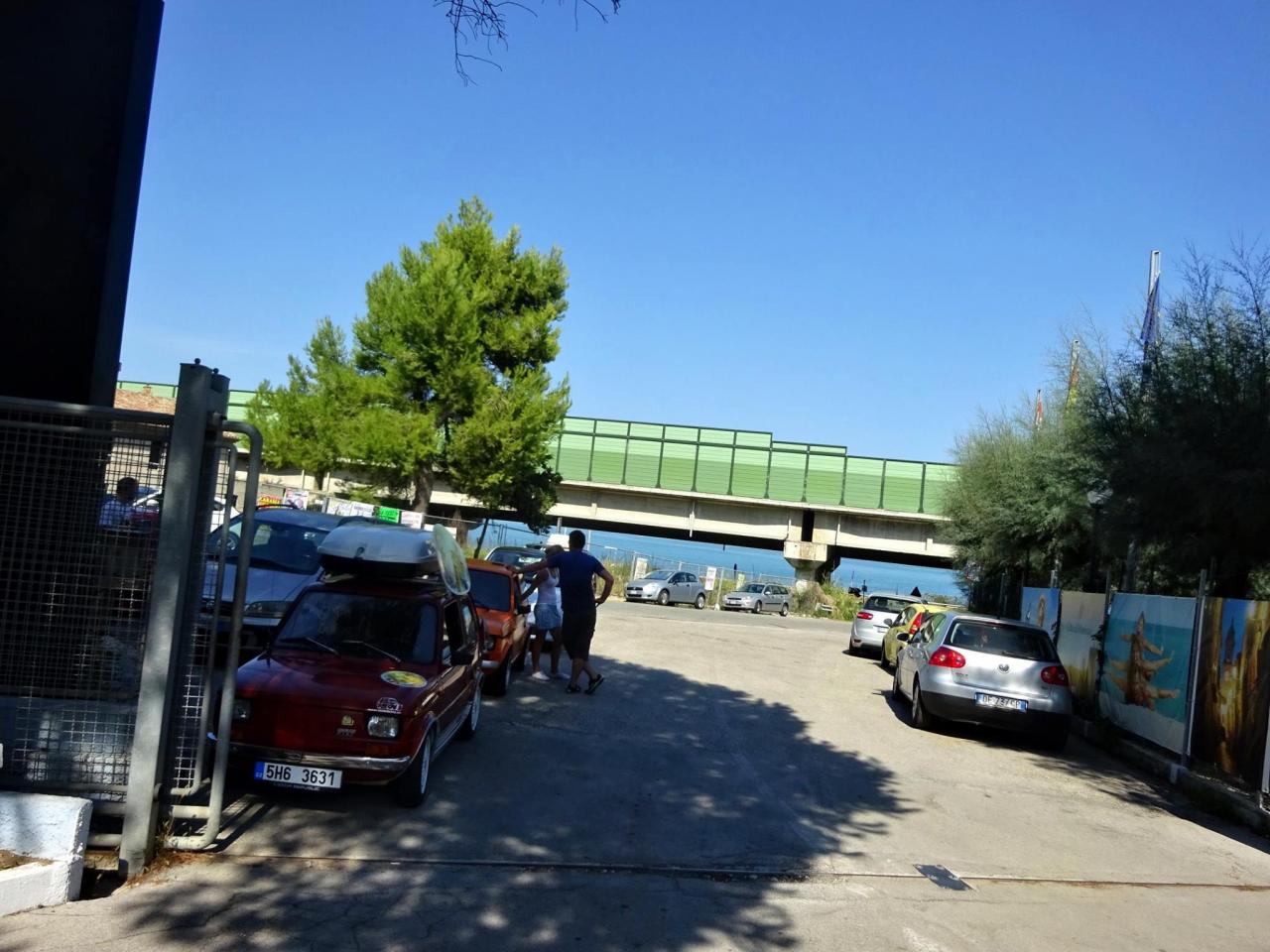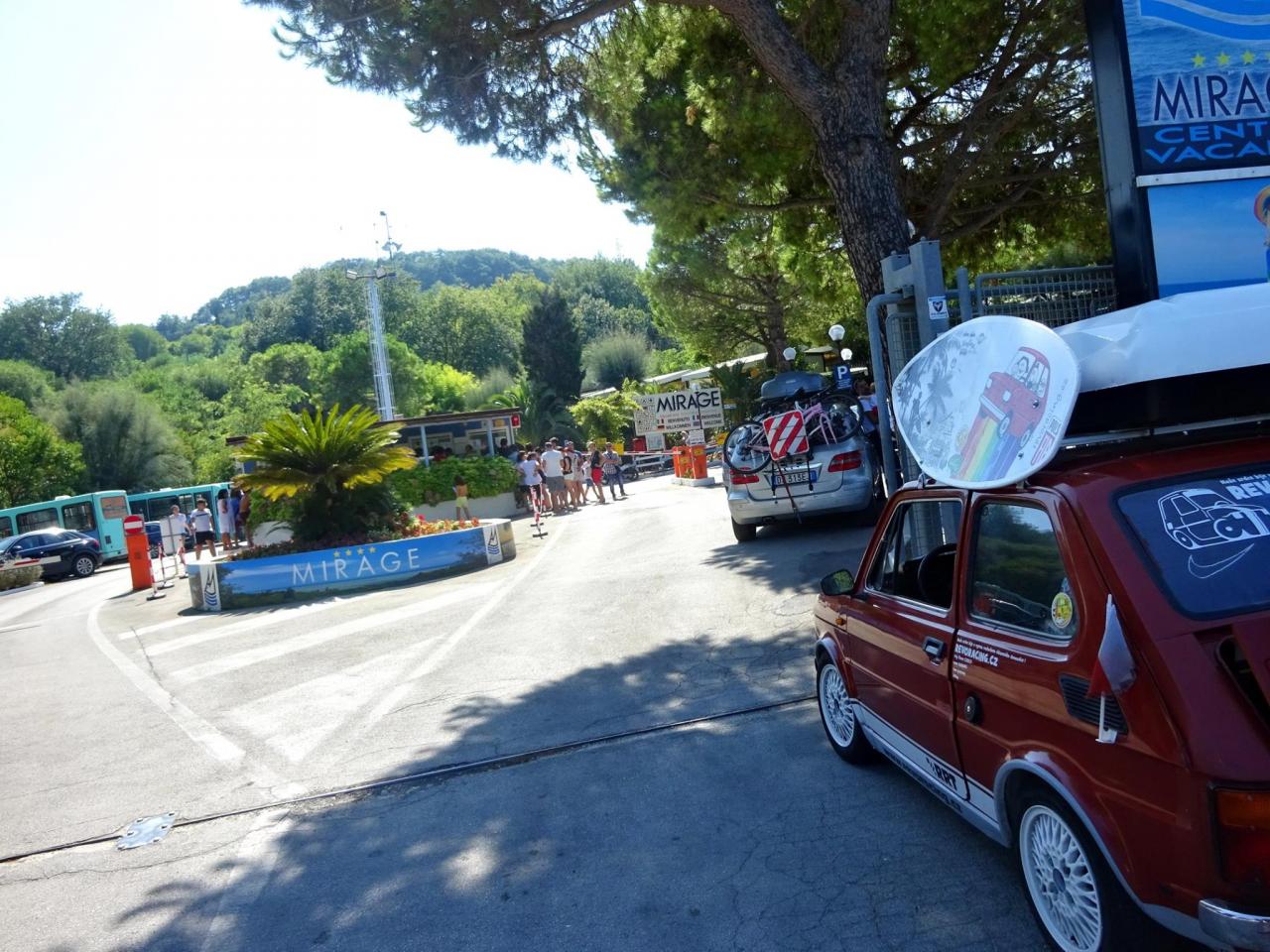 Cílem 7 dne byl zarezervovaný komp Centro Vacanze Mirage, kde jsme měli předem zaplacených 5 nocí přes cestovní kancelář. Po cestě se mi rozvítila kontrolka nabíjení. Nemá smysl čekat na vychladnutí motoru, když nám do cíle zbývalo asi 150km, tak jedeme dál, pravděpodobně regulátor. Auto se mi vymstilo, že jsem závadu neodstranil hned a tak se z ničeho nic zvedl volnoběh a auto na křižovatkách chcípalo. Závadu jsem přisuzoval k vybité baterce, avšak po chvilce jsem zjistil, že se nejedná o baterku, ale o prasklé těsnění pod karburátorem. Ještě, že to byla jen takováhle kravina za pár kaček. Opraveno a jedeme dál. Navečer jsme dojeli do cíle a hurá se ubytovat.