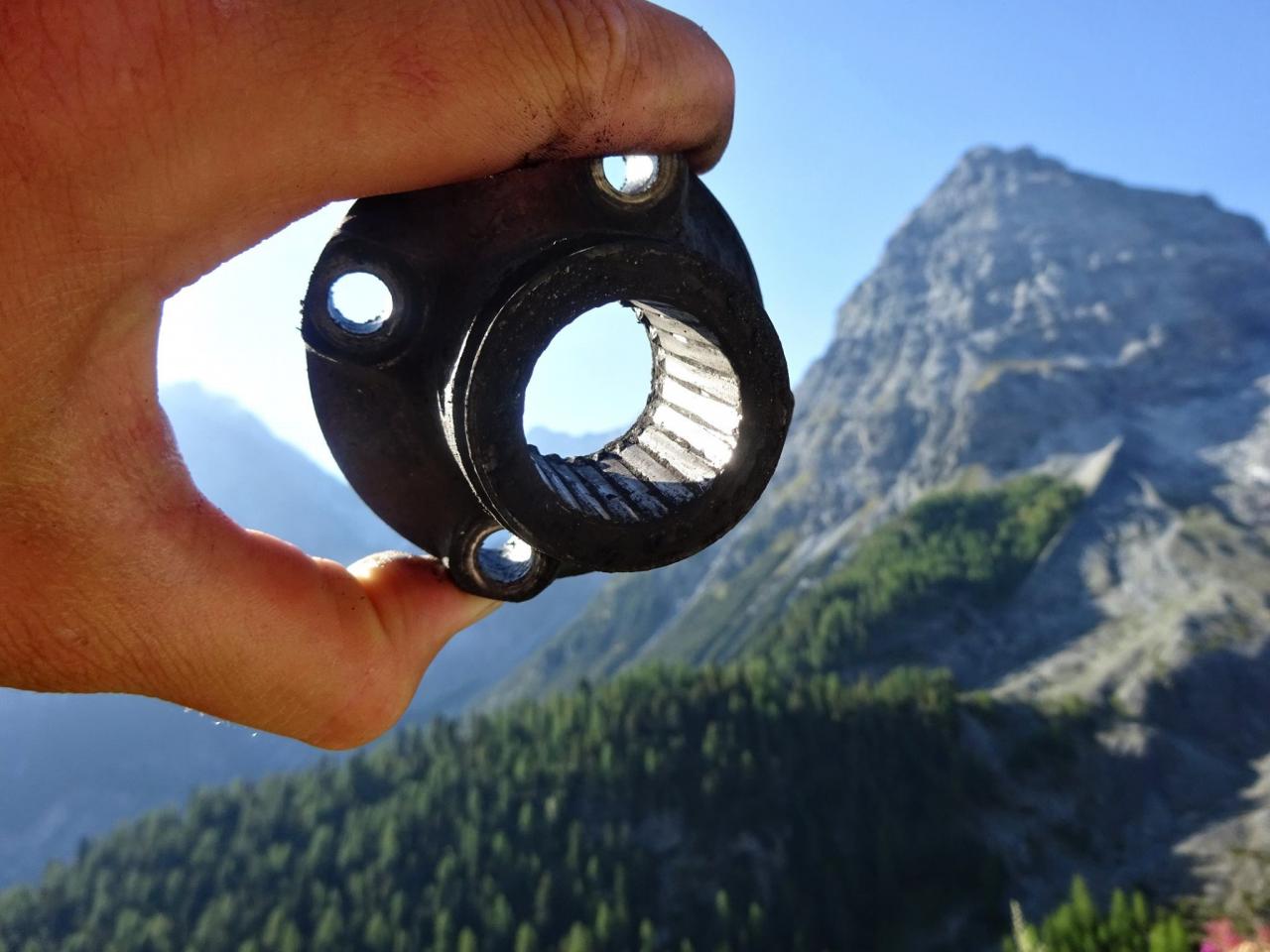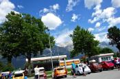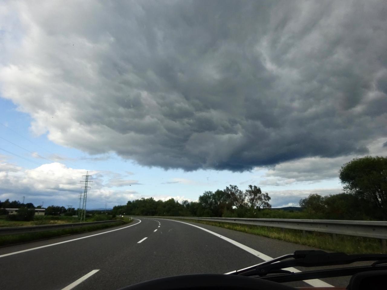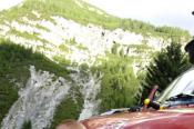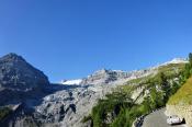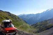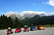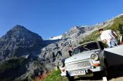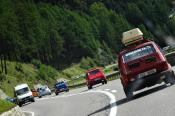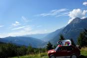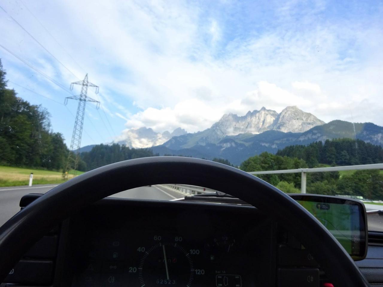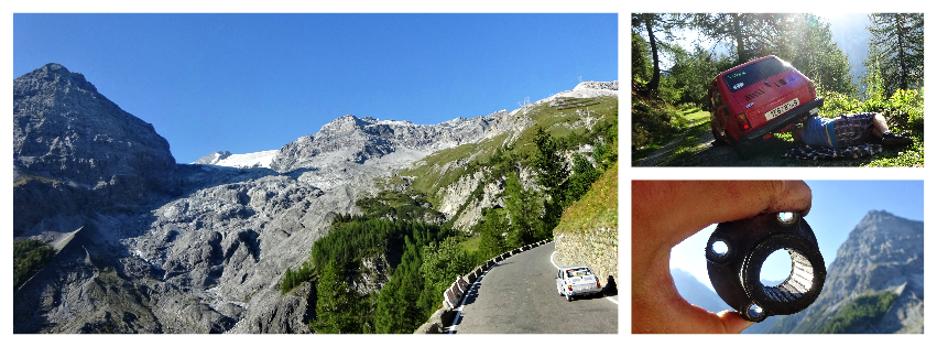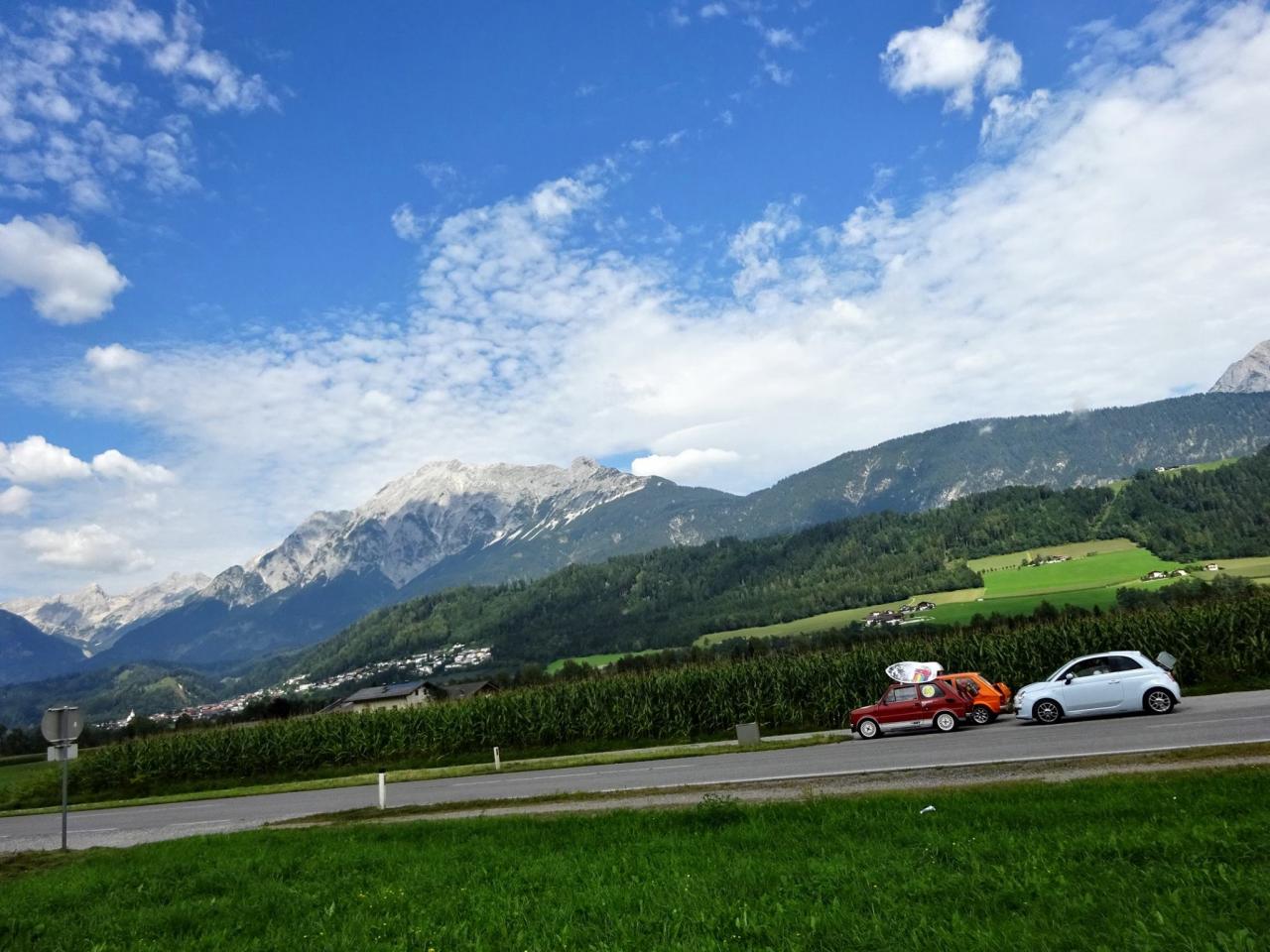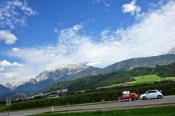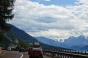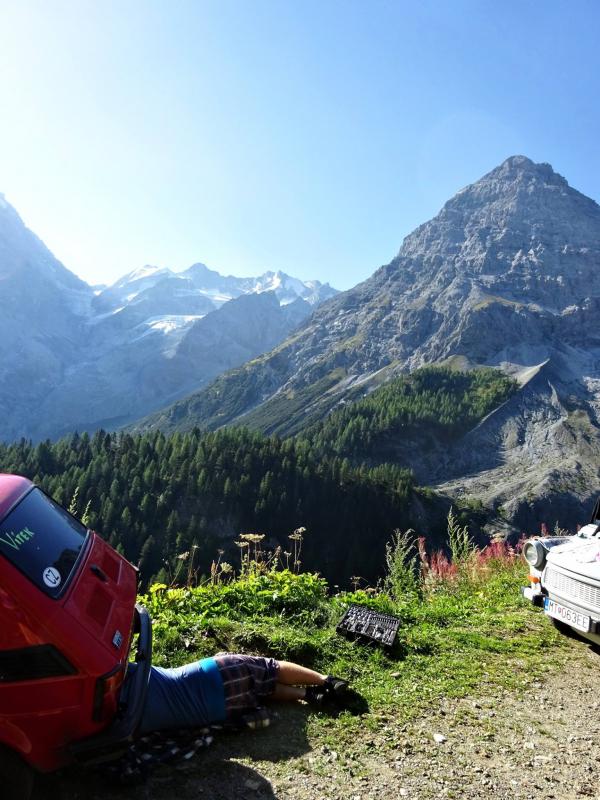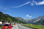 Trajekt máme za sebou, poslední úpravy trasy jsou za námi a můžeme vyrazit. Překračujeme rakouské hranice a již po 5km stavíme, protože se před námi naskytlo krásné panorama. No jo, krásné pro nás, ale bude všechno a tímhle tempem bychom asi daleko nedojeli. V tento moment přichází první závada, která se stala jednomu z účastníků ... praskl výfuk. Dobře, pojedeme a budeme hledat dílnu, kde by nám výfuk svařili. Toto se nám podařilo asi po 20 kilometrech. V jednom místním autoservise výfuk svařili za 10EURO, no co, hlavně, že můžeme jet dál. Natankováno a hurá skrz Rakousko do ALP. Hory kolem nás rostly závratnou rychlostí, panoramata, kterými jsme projížděli se minutu po minutě měnili. Pokaždé se před námi naskytl tak krásný pohled, že jsme chtěli neustále stavět a fotit. Já osobně jsem s sebou vezl kameru GoPro, kterou jsem měl neustále vysrtčenou z okénka ven svěšenou dolů. Často se mi stalo, že mi ruka odumírala, ale co by člověk pro krásné záběry neudělal. Dokonce mě z neustálého průvanu v autě začal pobolívat krk, ale to bych nebyl já, natáčení je důležitější a šála v létě to jistí.