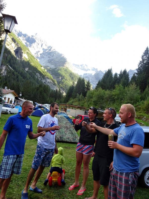 Po zaslouženém odpočinku se nám nikomu z kempu nechtělo, avšak cesta byla daleká. Cíl cesty byl Camp Trafoi, který se nacházel přímo pod jedním z nejznámnějšího průsmyků v Italských východního Alpách 200m od hranice se Švýcarskem a to Passo dello Stelvio s nadmořskou výškou 2758m/n/m, který byl cílem cesty následující den. Když jsem řekl, že Camping Grubhof bylo místo na kempování nádherné, Camp Trafoi ho jednoznačně strčil do kapsy. Stany jsme rozložili na travnatém místečku, ze kterého byly vidět ohromné hory se zasněženými vrcholky a pod námi byla slyšet místní horská řeka. Posuďte samy, místo to bylo úchvatné. Ráno jsme na teploměrech naměřili 5 stupňů, za to nebylo takové vlhko. Všichni jsme přežili, jedeme dál ...