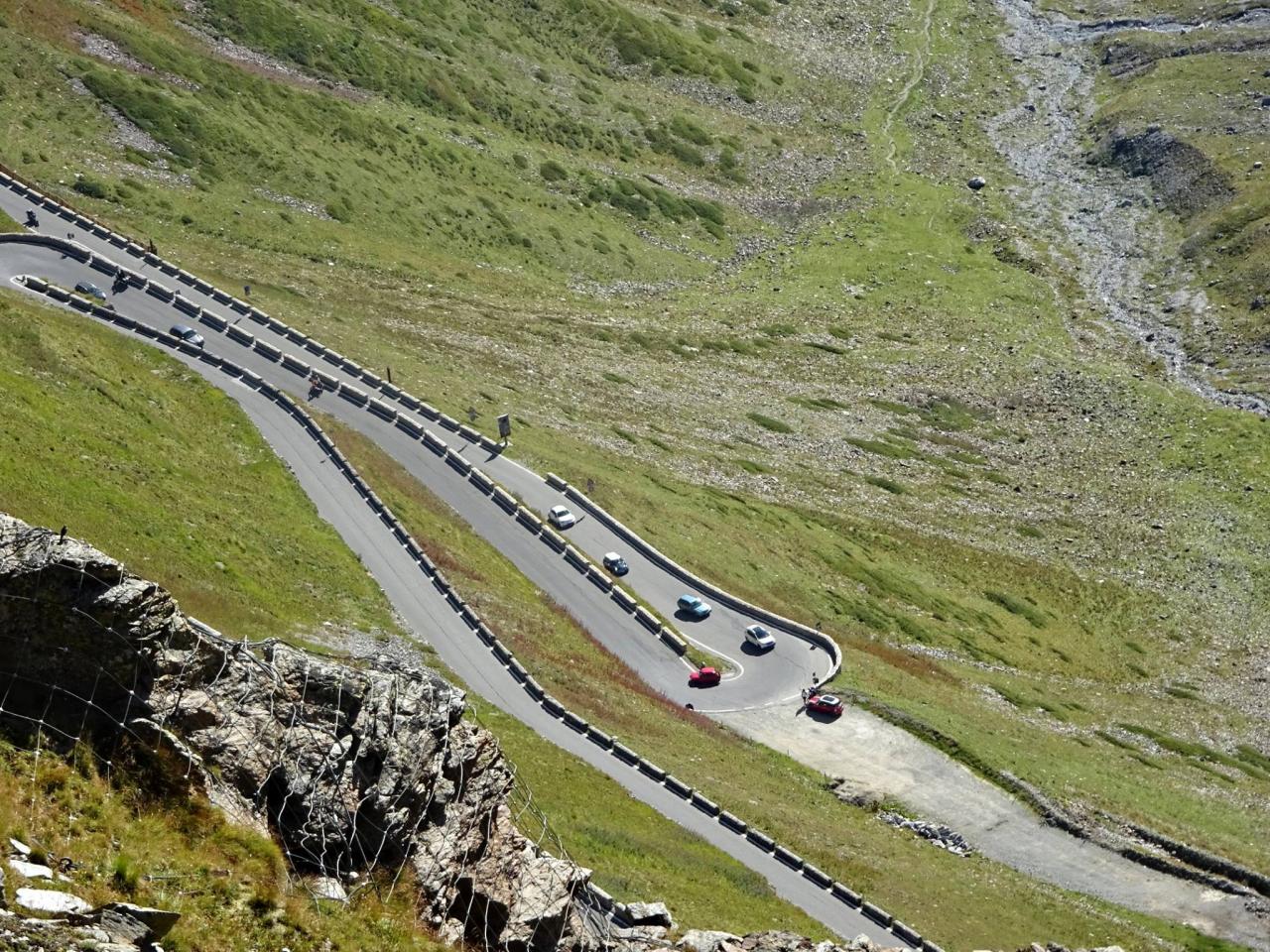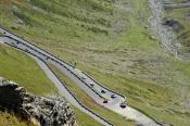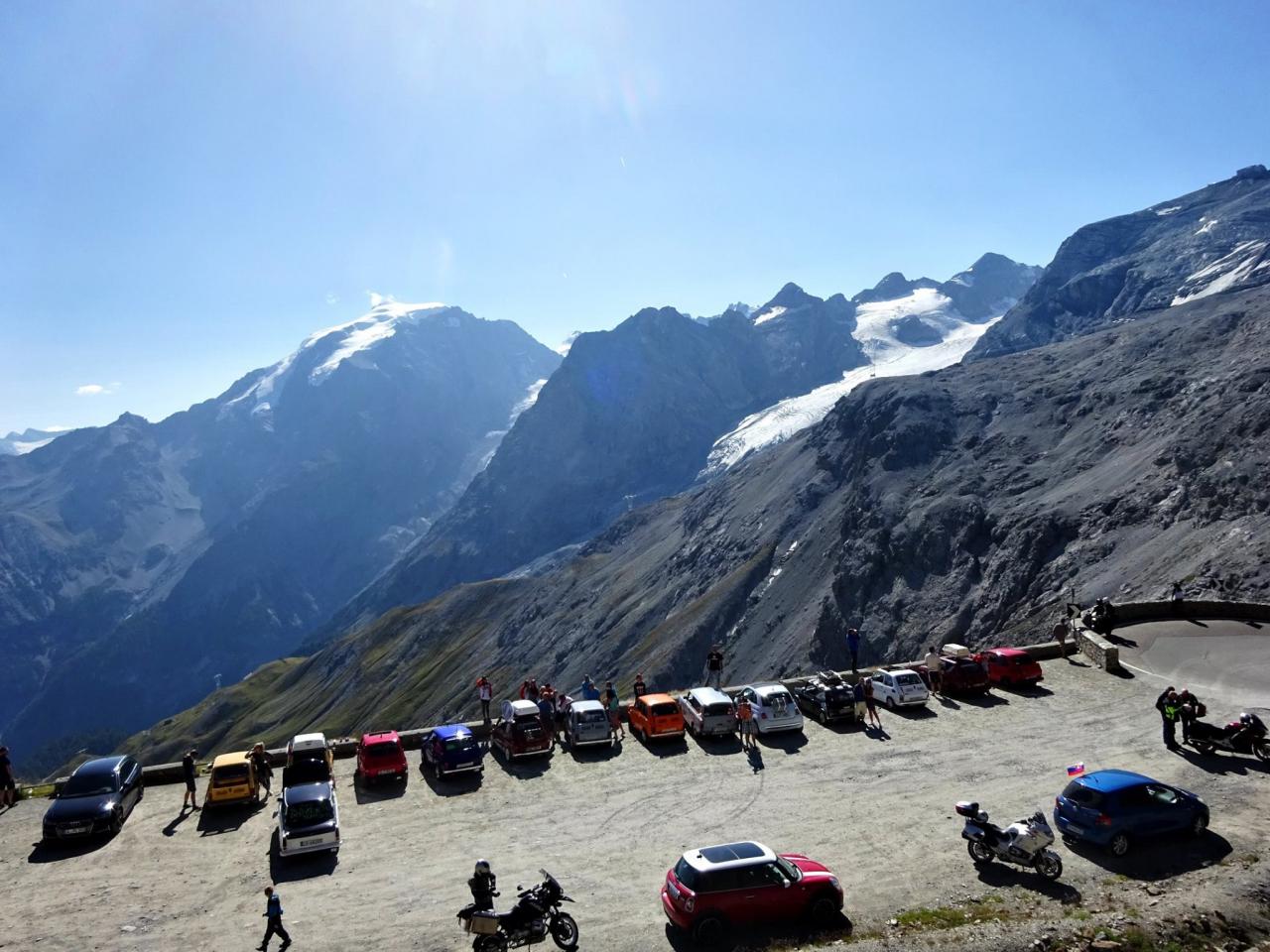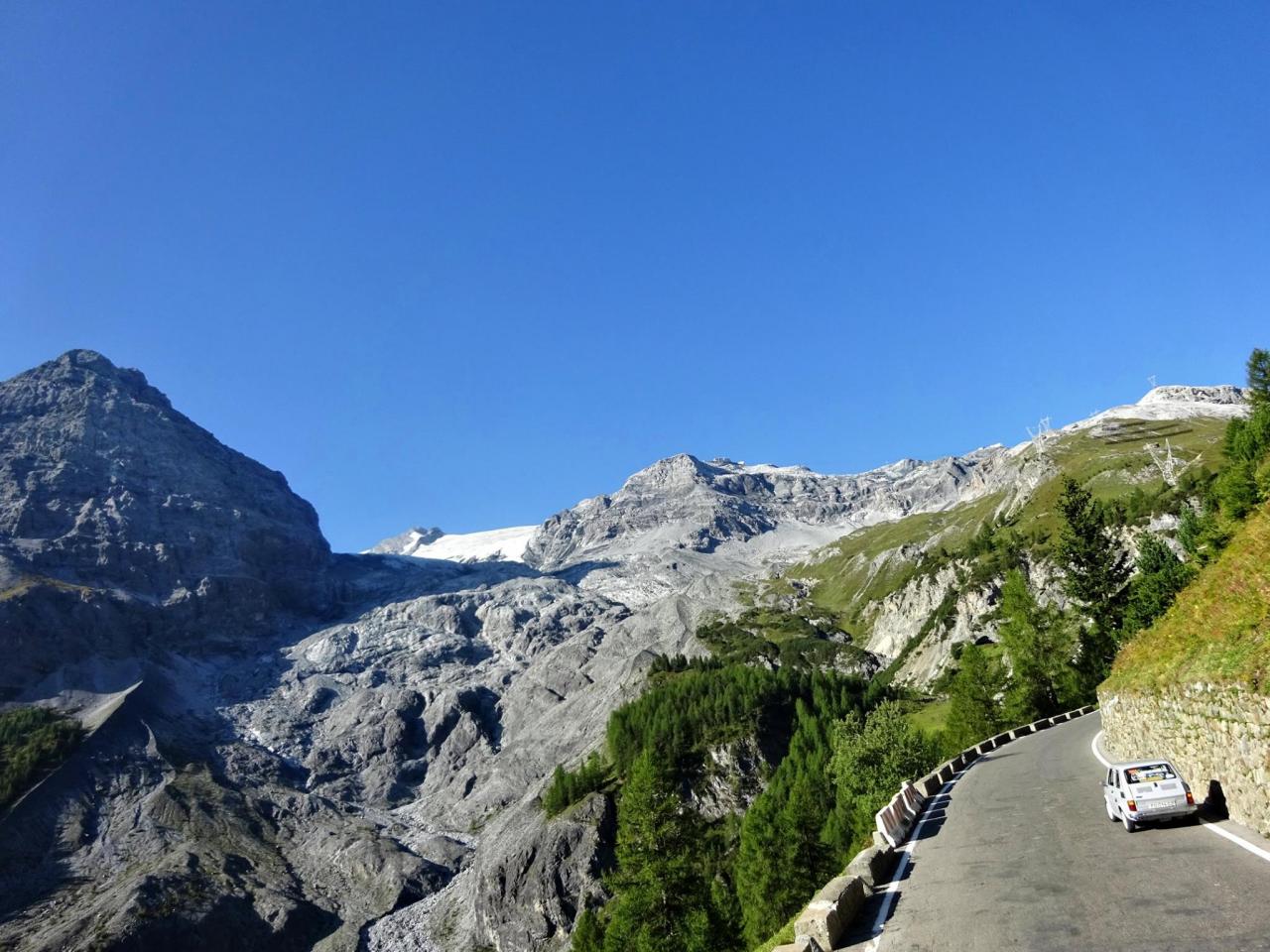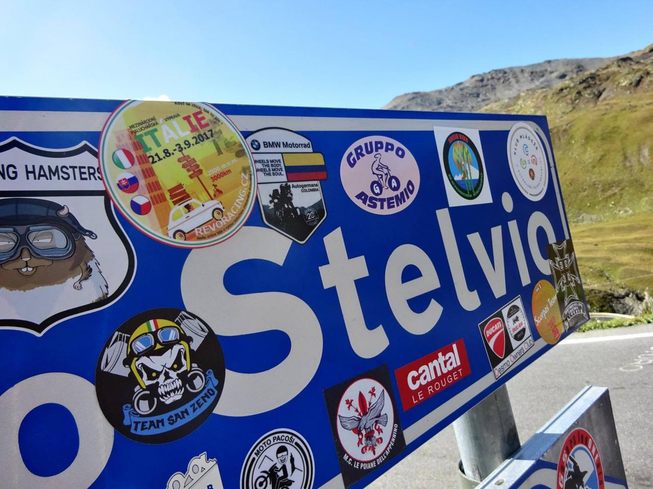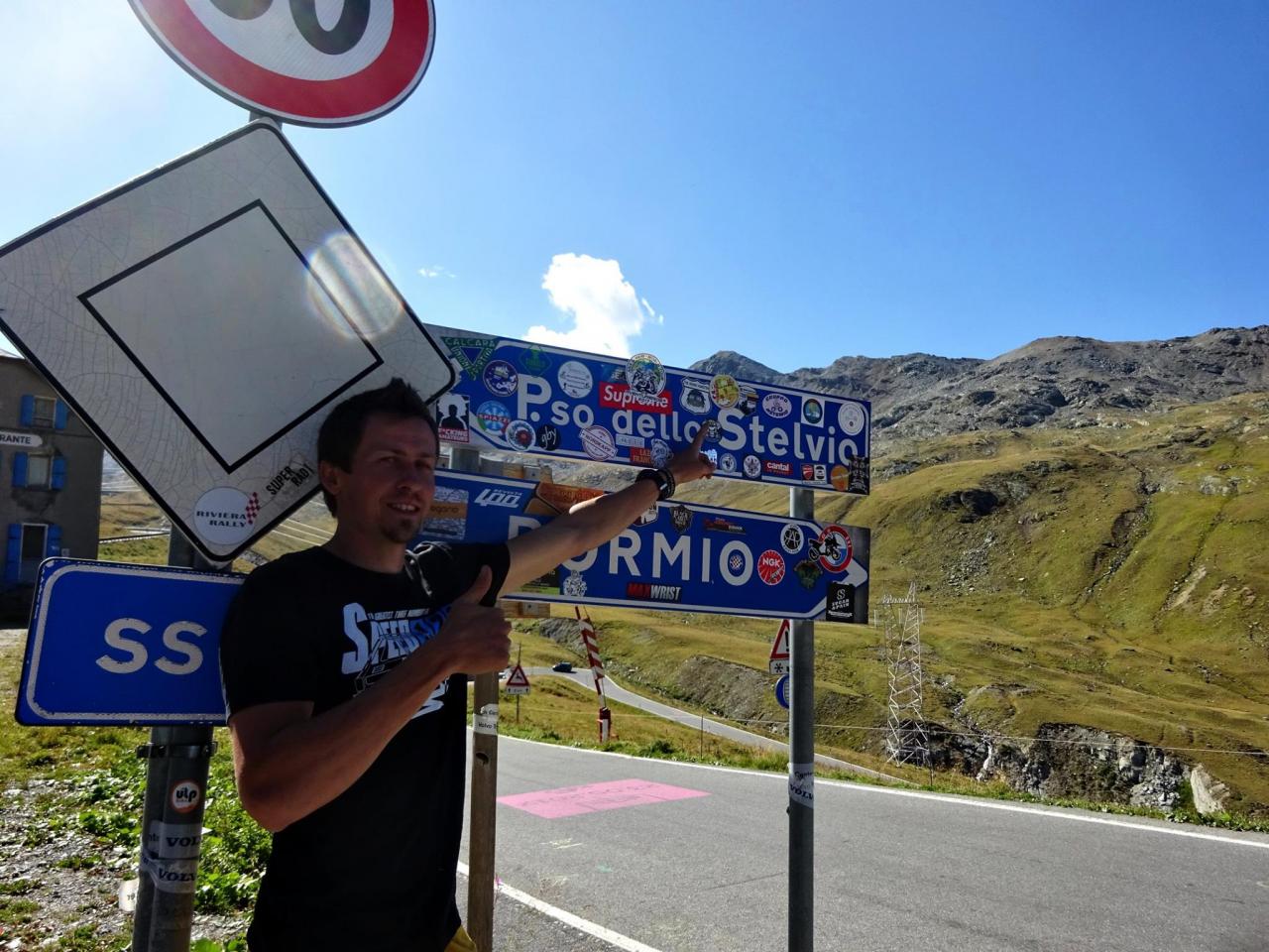 Vrcholek se blíží, nekonečné začáčky sem a tam jsou za námi a na vrcholu cesty nás vítají ostatní účastníci hlasitým pokřikem a máváním. ,,Jsme tu, dokázali jsme to, pokořili jsme Passo Dello Stelvio a VŠICHNI" ! Auto se na vrcholek škrábalo statečně a bez problémů, i když chudák malý sedí až na dorazech, jak je naložený. Vůbec se nám nechtělo pryč, osobně bych si mohl nahoře rozložit lehátko a nasávat klid, pohodu, krásné počasí .. prostě idilka. Nedá se nic dělat, jedeme dál. Sjíždíme druhou stranou směrem do Itálie na Bormio.