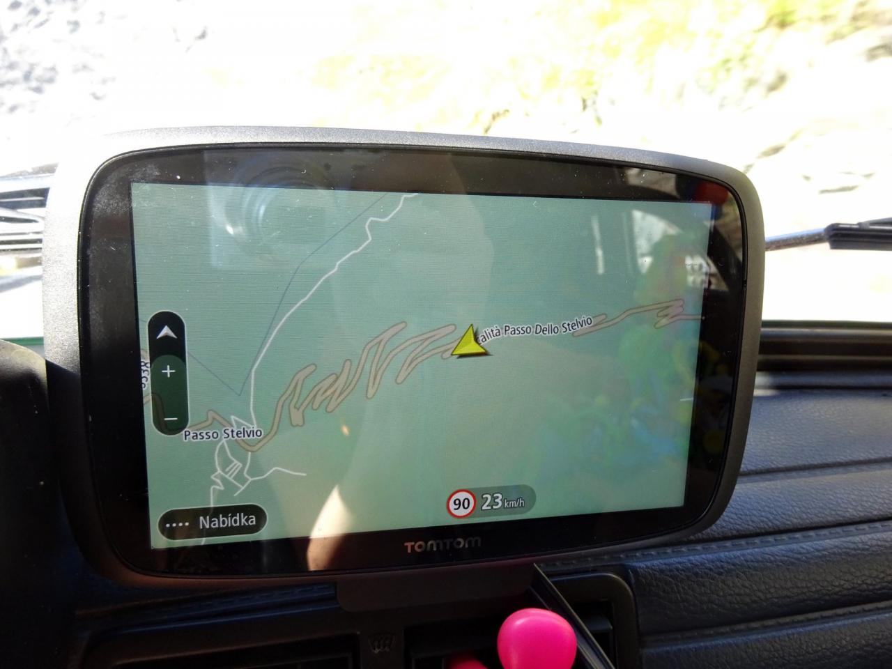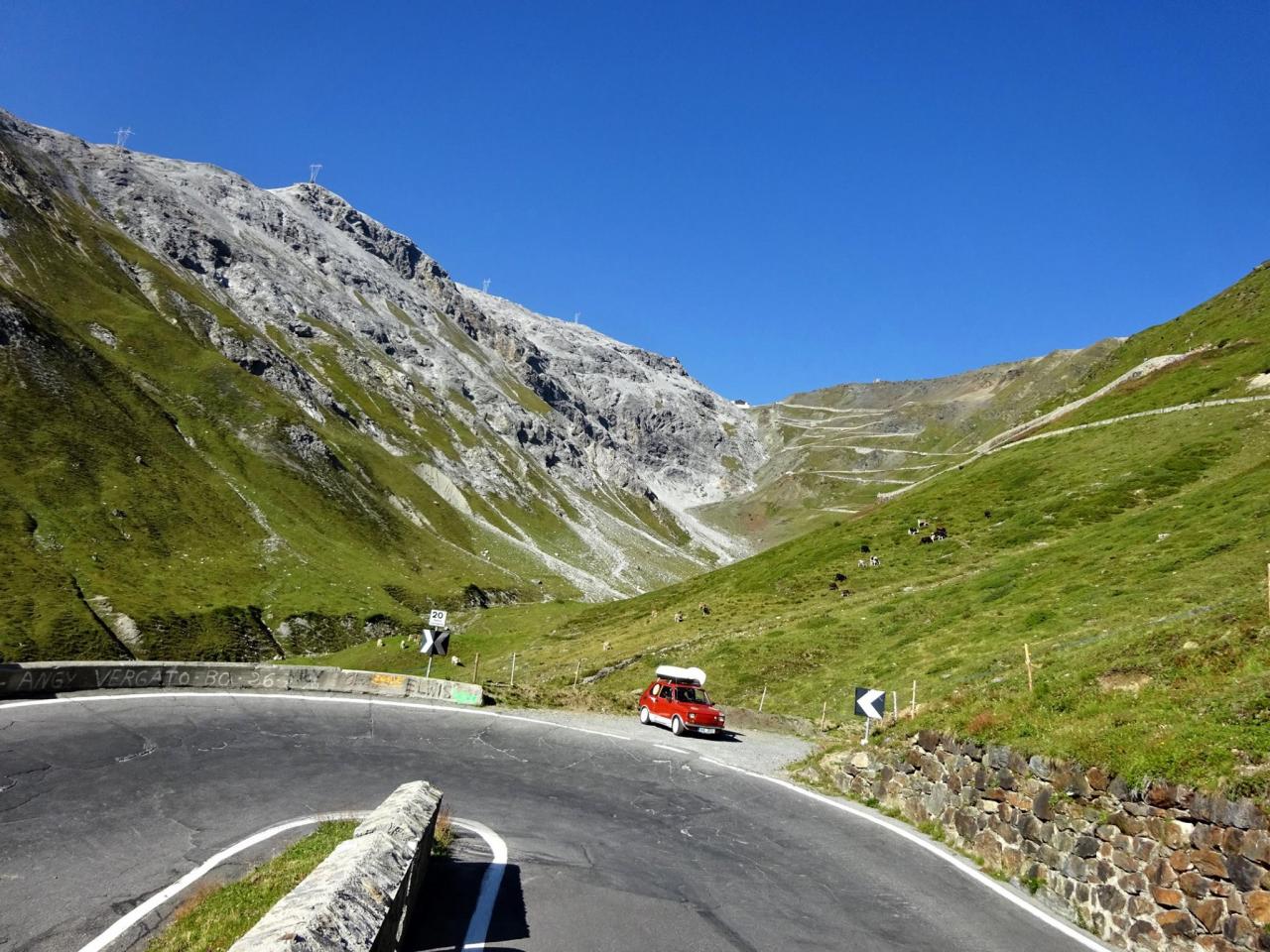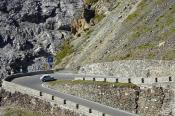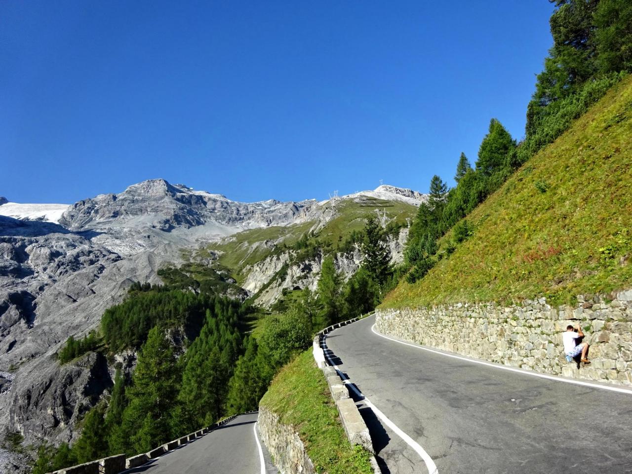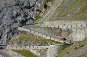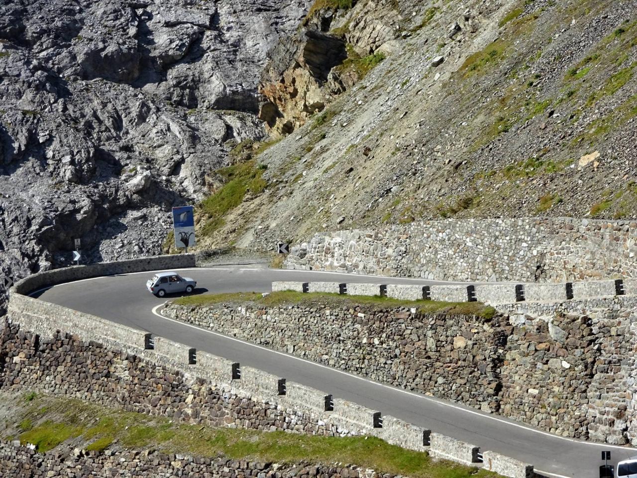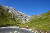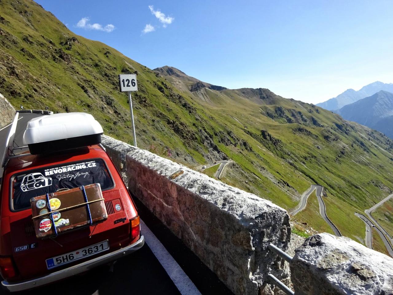 Zhruba v jedné třetině dojíždím několik aut zastavených v kopci a blikající výstražnými světly. Nikdo nefotí auta, to je divné. Když jsem zastavil a optal se, co se děje, uslyšel jsem: ,,Asi se rozkočil diferák". Joo tak to je v ..deli, no nic, zacouváme na odpočívadlo a najdeme závadu. Nakonec jsme zjistili, že se protočil jen litinový zvoneček na poloose, proto auto přestalo jet. ,,Fílo, máš zvoneček"? No jasně, že mám, to bych nebyl já, abych v kufru nevozil náhradní celé auto. Tímto okamžikem jsem přišel o jeden zvoneček (v průběhu výpravy i o ten druhý). Ještě, že s sebou vozím dva. Vyrážíme na cestu, jedeme dál k nejznámějšímu úseku Stelvia. Po chvilce jízdy se před námi objedvila nádherná klikatice lemovaná zdí, takže nebylo kam spadnout, což se o Hochalpenstrasse nedá říct, tam se člověk podíval dolů a šla mu husí kůže ze srázů kolem cesty. Cesta na Stelvio je daleko bezpečnější. Cestu si užíváme, v autě je ticho, občas jen děti prohodí nějakou hlášku, nebo halekají. My se ženou s údivem a otevřenou pusou jedeme nahoru. Zhruba v polovině zastavujeme a fotíme se u cedule 126. Proč ne, tohle musí být, třeba se sem už nikdy nepodívám. Určitě se ptáte, když jedeme nahoru, že musíme ostatní zdržovat. V žádném případě, na cestě se nachází spousta rozšířených míst a vzhledem k tomu, že jsme se nahoru pohybovali raketovou rychlostí, nikoho jsme naštěstí nezdržovali a nikdo nemusel nervózně troubit. :)