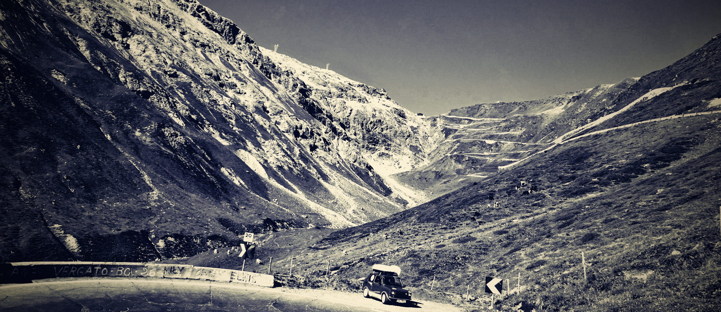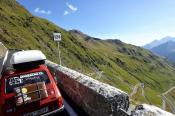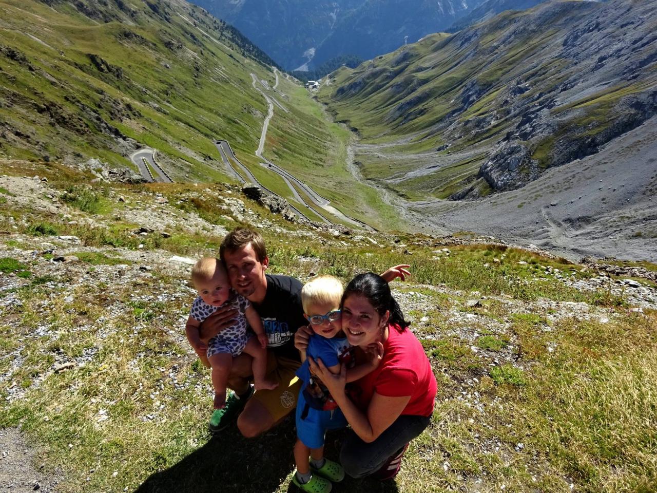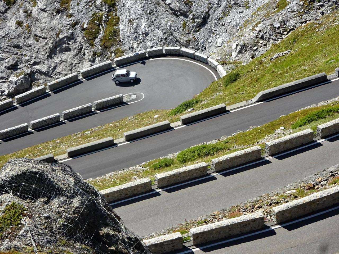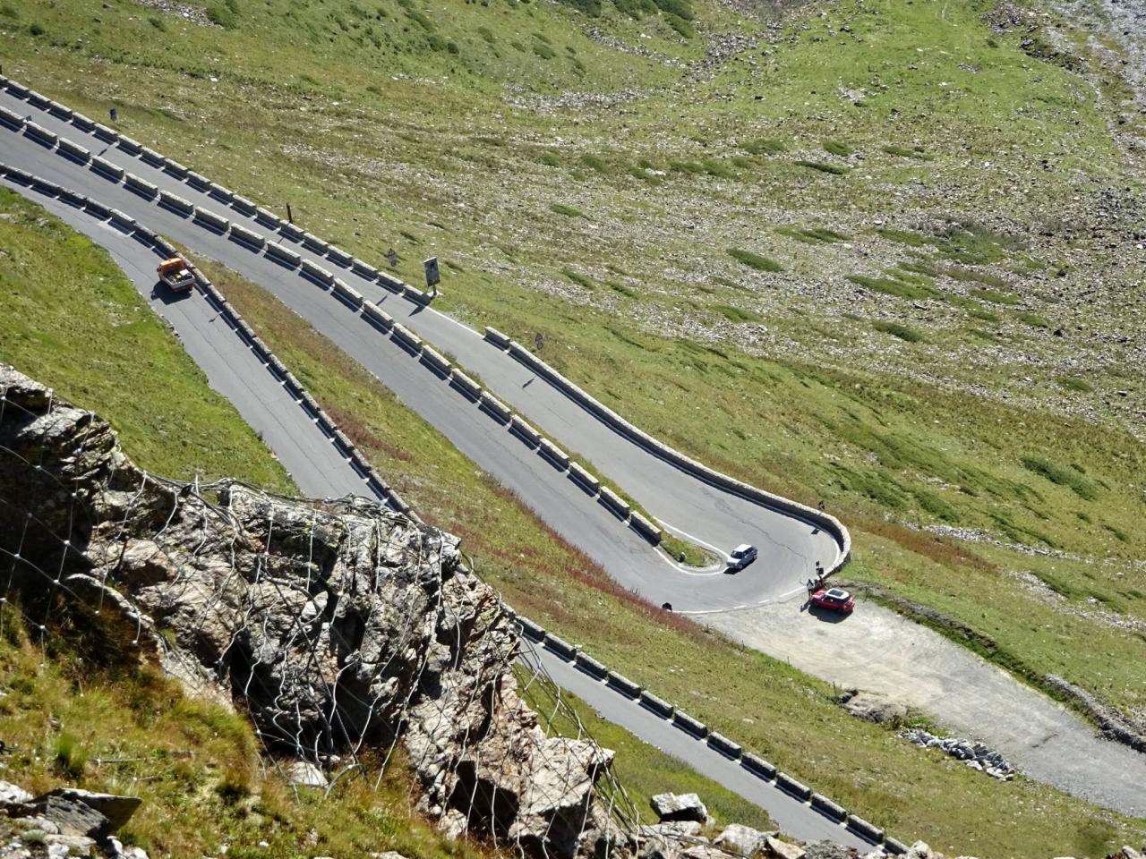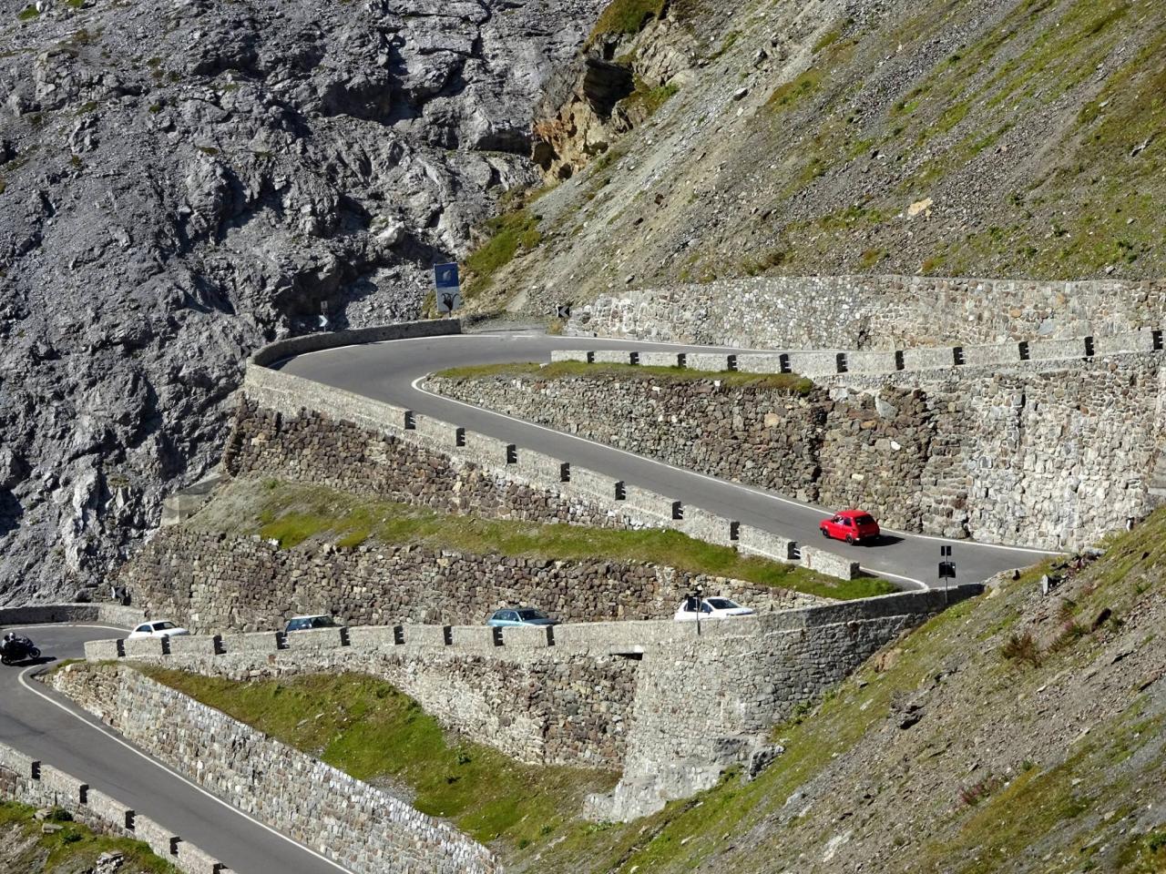 Zhruba v jedné třetině dojíždím několik aut zastavených v kopci a blikající výstražnými světly. Nikdo nefotí auta, to je divné. Když jsem zastavil a optal se, co se děje, uslyšel jsem: ,,Asi se rozkočil diferák". Joo tak to je v ..deli, no nic, zacouváme na odpočívadlo a najdeme závadu. Nakonec jsme zjistili, že se protočil jen litinový zvoneček na poloose, proto auto přestalo jet. ,,Fílo, máš zvoneček"? No jasně, že mám, to bych nebyl já, abych v kufru nevozil náhradní celé auto. Tímto okamžikem jsem přišel o jeden zvoneček (v průběhu výpravy i o ten druhý). Ještě, že s sebou vozím dva. Vyrážíme na cestu, jedeme dál k nejznámějšímu úseku Stelvia. Po chvilce jízdy se před námi objedvila nádherná klikatice lemovaná zdí, takže nebylo kam spadnout, což se o Hochalpenstrasse nedá říct, tam se člověk podíval dolů a šla mu husí kůže ze srázů kolem cesty. Cesta na Stelvio je daleko bezpečnější. Cestu si užíváme, v autě je ticho, občas jen děti prohodí nějakou hlášku, nebo halekají. My se ženou s údivem a otevřenou pusou jedeme nahoru. Zhruba v polovině zastavujeme a fotíme se u cedule 126. Proč ne, tohle musí být, třeba se sem už nikdy nepodívám. Určitě se ptáte, když jedeme nahoru, že musíme ostatní zdržovat. V žádném případě, na cestě se nachází spousta rozšířených míst a vzhledem k tomu, že jsme se nahoru pohybovali raketovou rychlostí, nikoho jsme naštěstí nezdržovali a nikdo nemusel nervózně troubit. :)