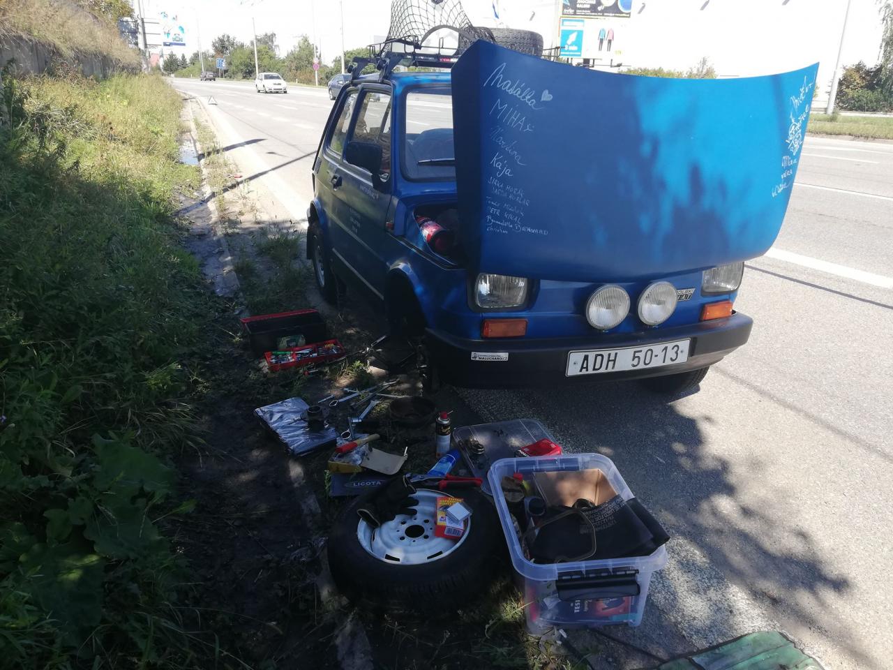 Poruchy na cestě jsme řešily celkem 3. První dvě se objevily už v Českých Budějovicích. Jednalo se o zadřená ložiska na přední nápravě. Tento problém vznikl nejspíše mojí neodbornou montáží při kompletování automobilu. Naštěstí máme hodné kamarády, kteří nám s opravou pomohli a jelo se dál. Třetí a poslední problém vznikl v Maďarsku, kde nám praskla brzdová trubka. Odnesli jsme ji maďarskému traktoristovi a za deset minut nám ji přinesl zcela opravenou.